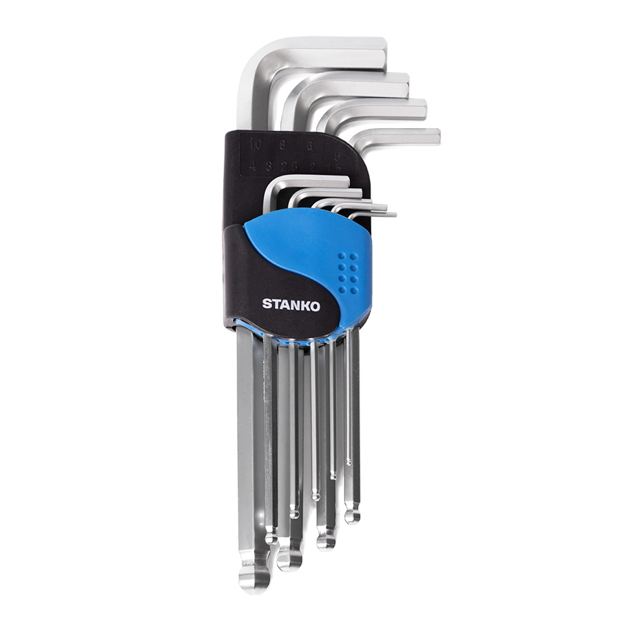 Набор угловых шестигранных ключей, состоит из 9 L-образных ключей, имеющих профиль HEX.