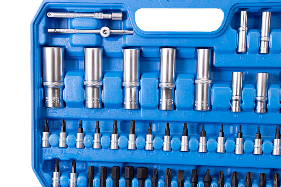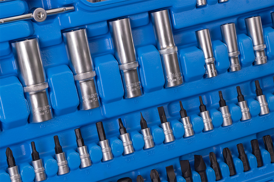 Рациональное размещение инструментов в кейсе обеспечивает удобство транспортировки и облегчает поиск необходимого инструмента. Сами инструменты расположены в индивидуальных подписанных ячейках, снабженных фиксаторами.
