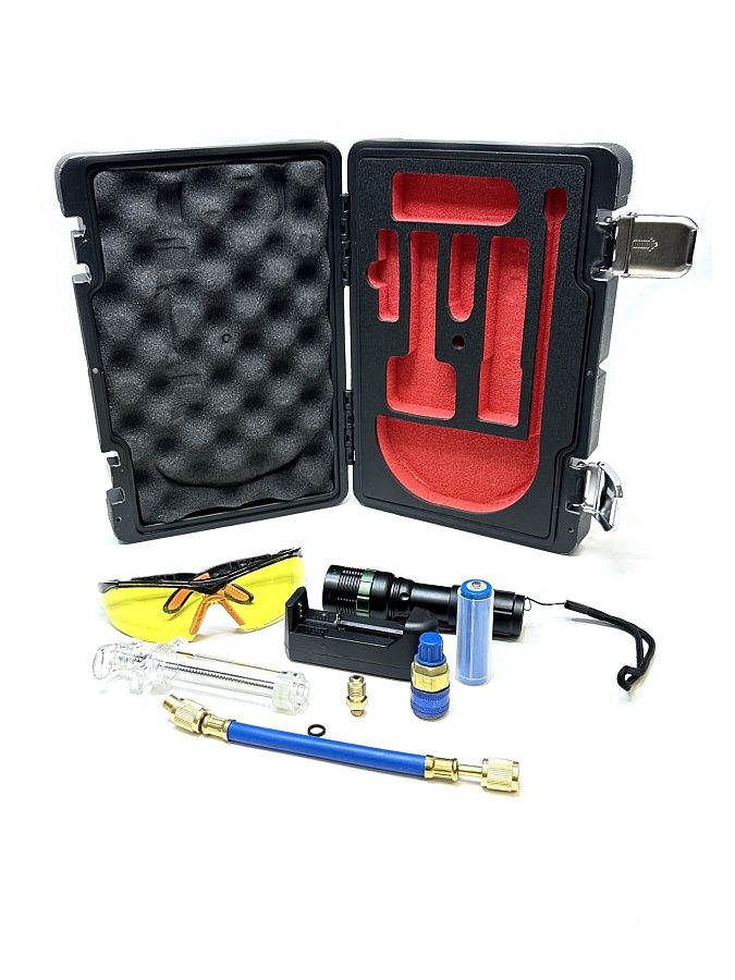 Набор применяется для поиска утечек хладагента в системе кондиционирования автомобилей, работающих на хладагенте R134A.