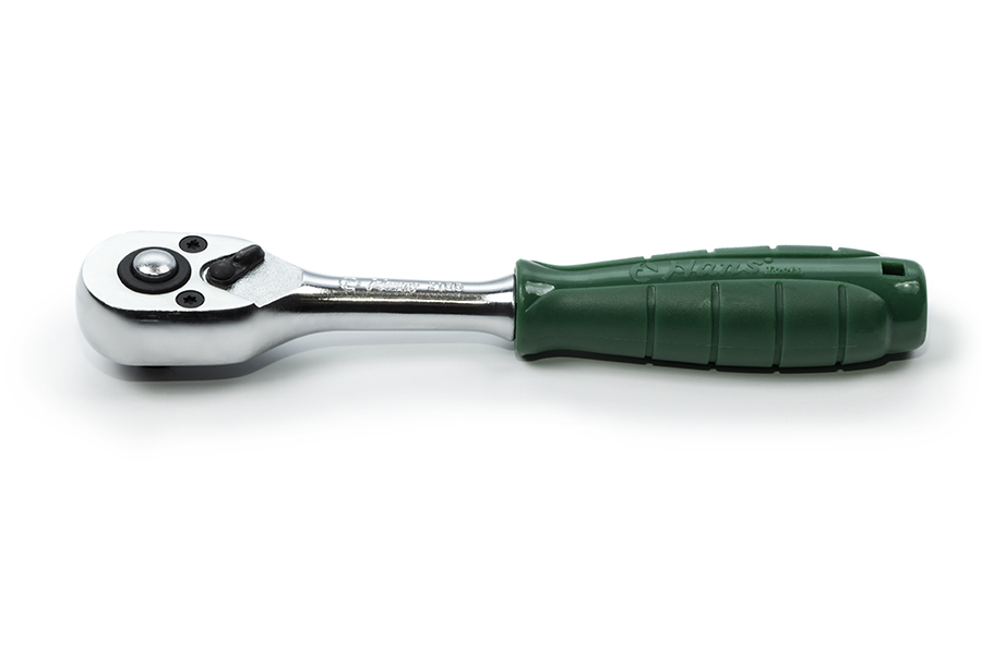 Трещотка с храповым механизмом отличается простотой и удобством в применении. Трещоточный механизм ключа позволит работать им, не отрывая от закручиваемой детали. Резиновая накладка на ручке не позволяет инструменту скользить. Имеет флажок реверса и кнопку быстрого сброса.